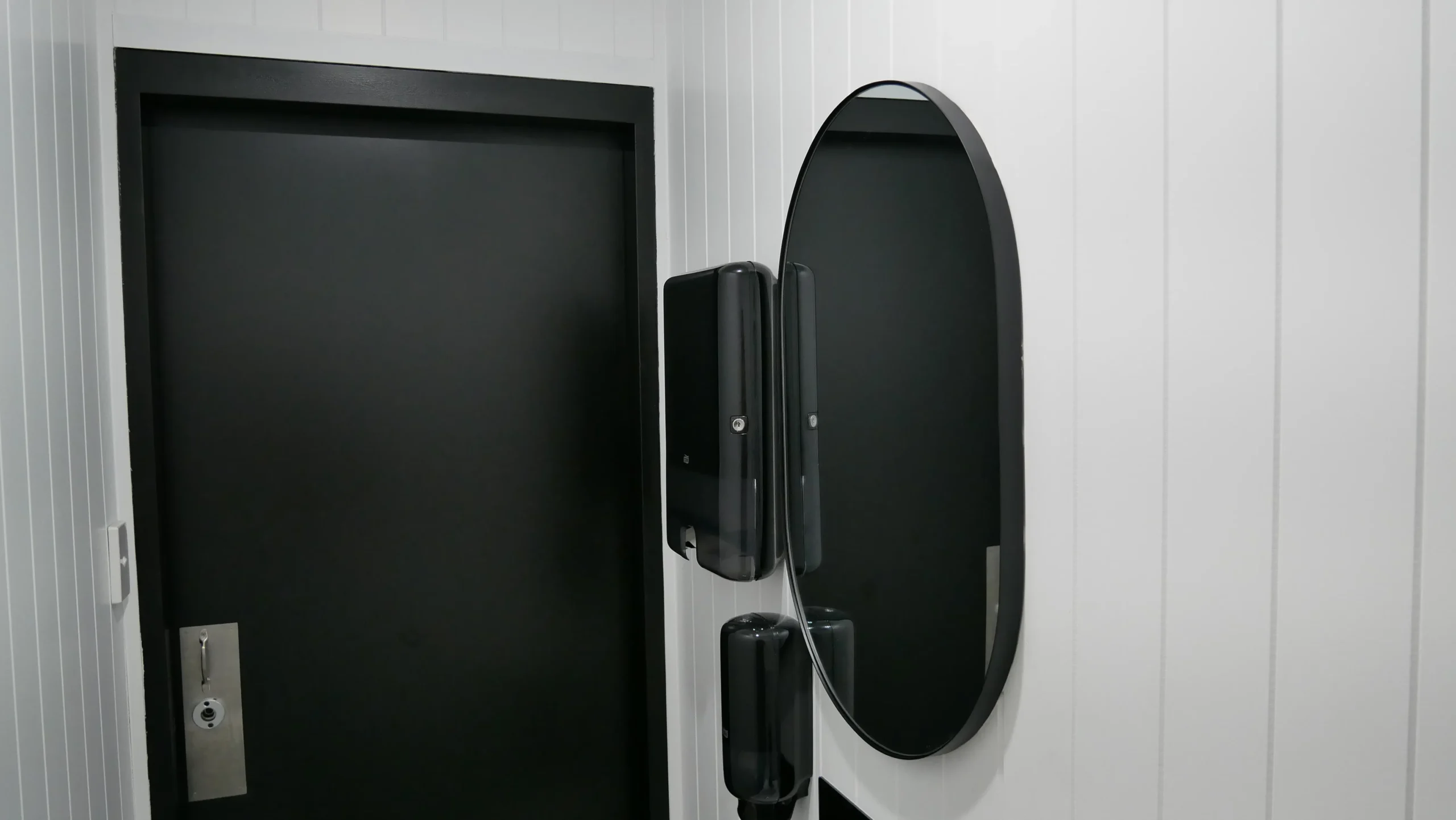 The container is painted in a color of choice and has roof insulation with EPS panels to reduce heat. Insulated panel partitions divide the male and female areas to ensure privacy.