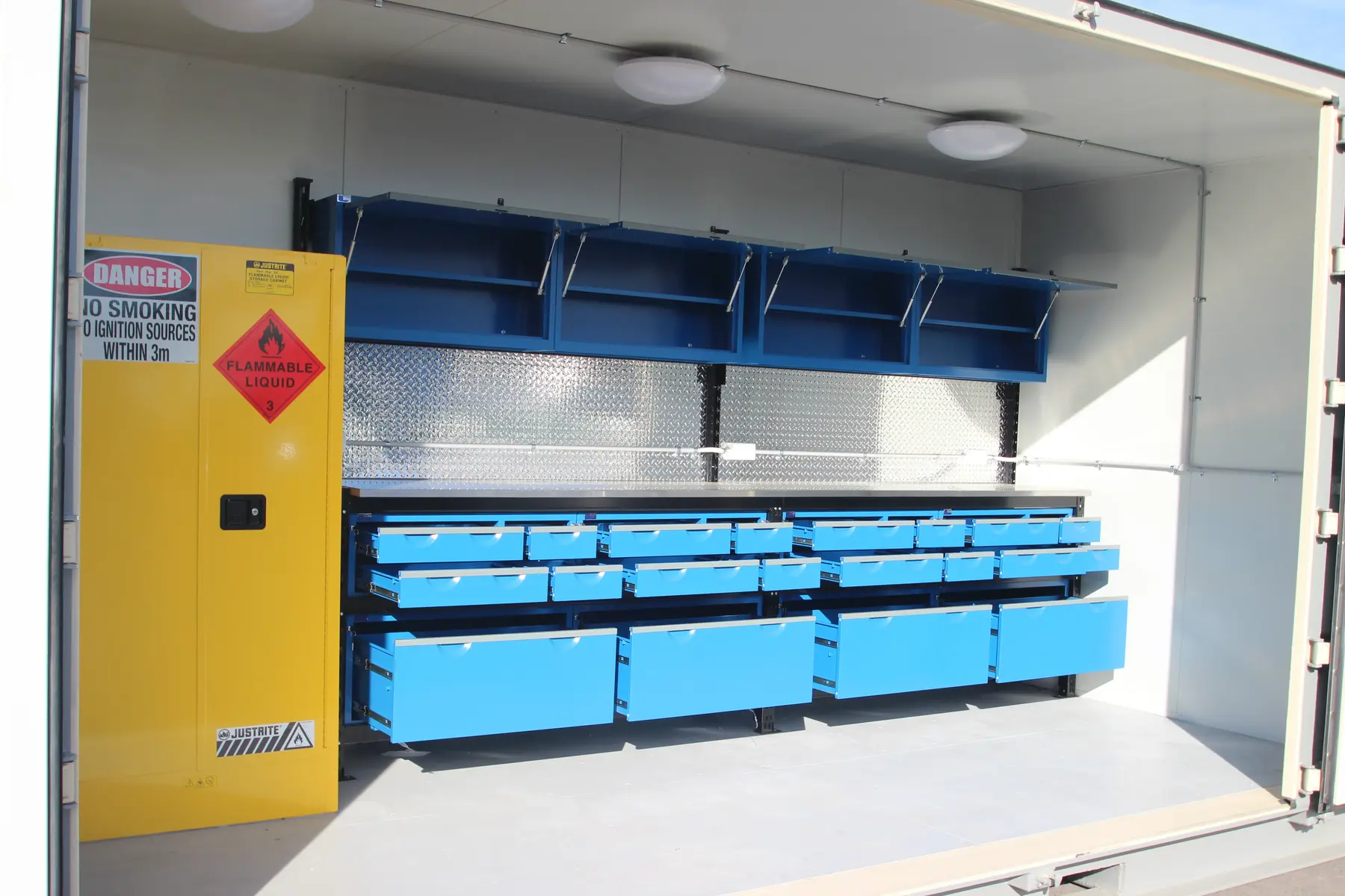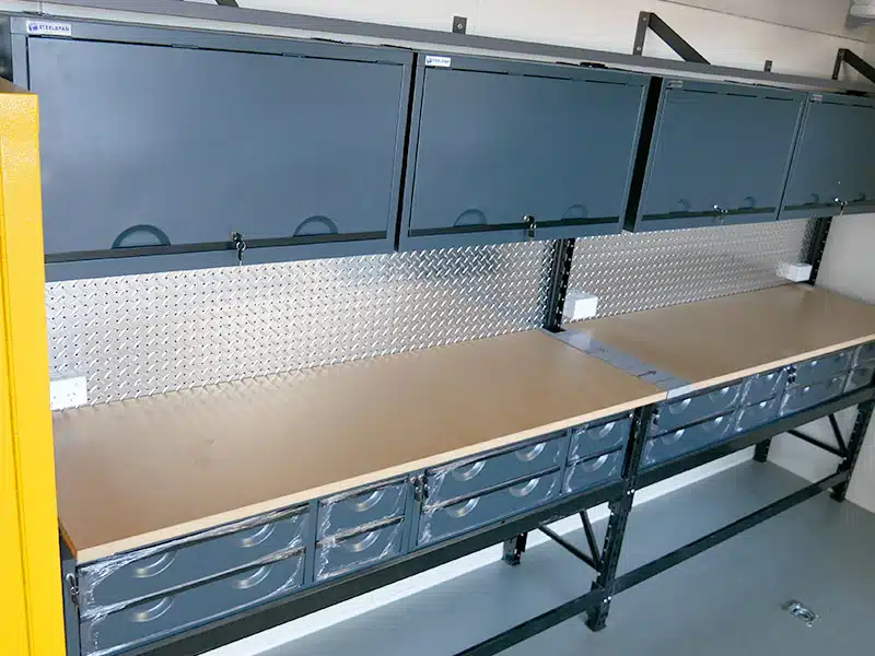 Selain dirancang dengan pintu samping yang memudahkan akses penuh ke ruang kerja, side opening workshop container dari Tradecorp dilengkapi dengan meja kerja ganda, laci, kabinet overhead, serta rak jaring baja empat tingkat dan instalasi listrik lengkap. Fitur-fitur ini memastikan bahwa ruang kerja Anda siap digunakan dan terorganisasi dengan baik untuk meningkatkan produktivitas di berbagai aplikasi industri.