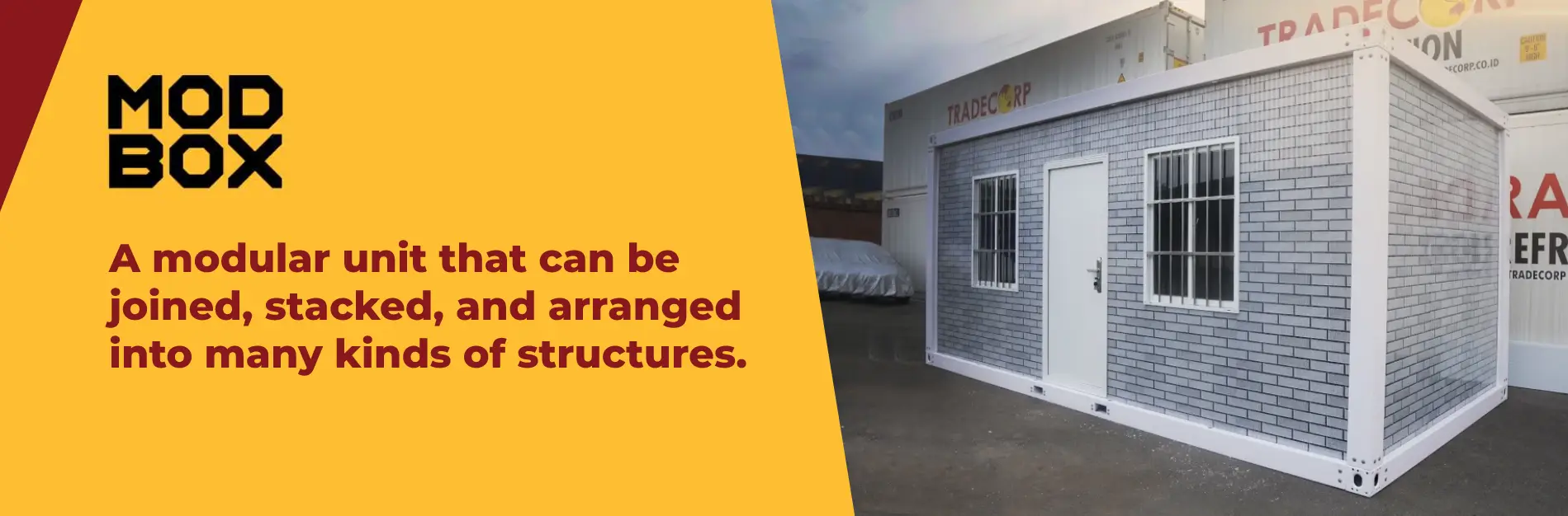 Salah satu bangunan prefab yang dijual Tradecorp adalah prefab modular ModBox yang dirancang sesuai dengan kebutuhan pasar, baik dari segi efisiensi maupun efektivitas.